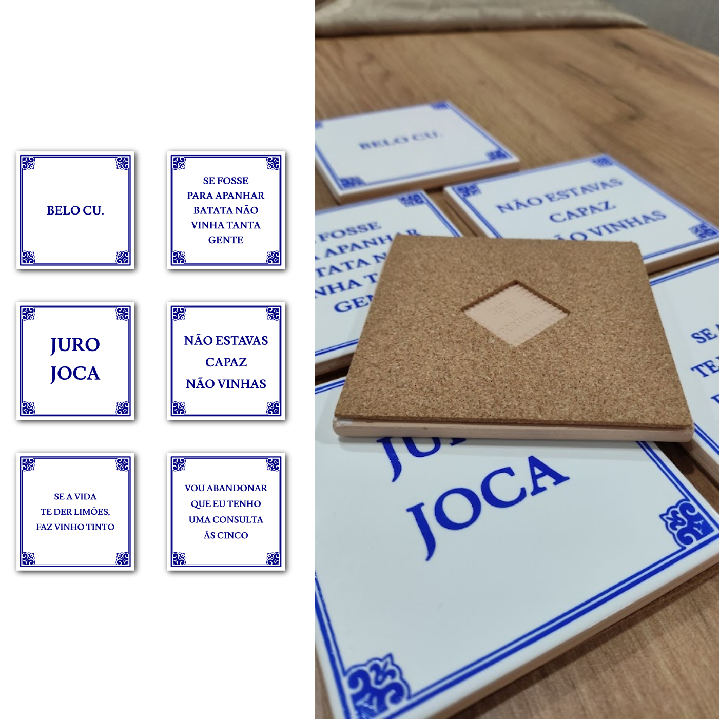 6 bases de copos 27,00 € Desconto de %. IVA incluído. Partilhar Comprar Contactar Bases de copos 10cm x 10cm sortidas: Belo cu. Se fosse para apanhar batata não vinha tanta gente Juro Joca Não estavas capaz não vinhas Se a vida te der limões, faz vinho tinto Vou abandonar que eu tenho uma consulta às cinco